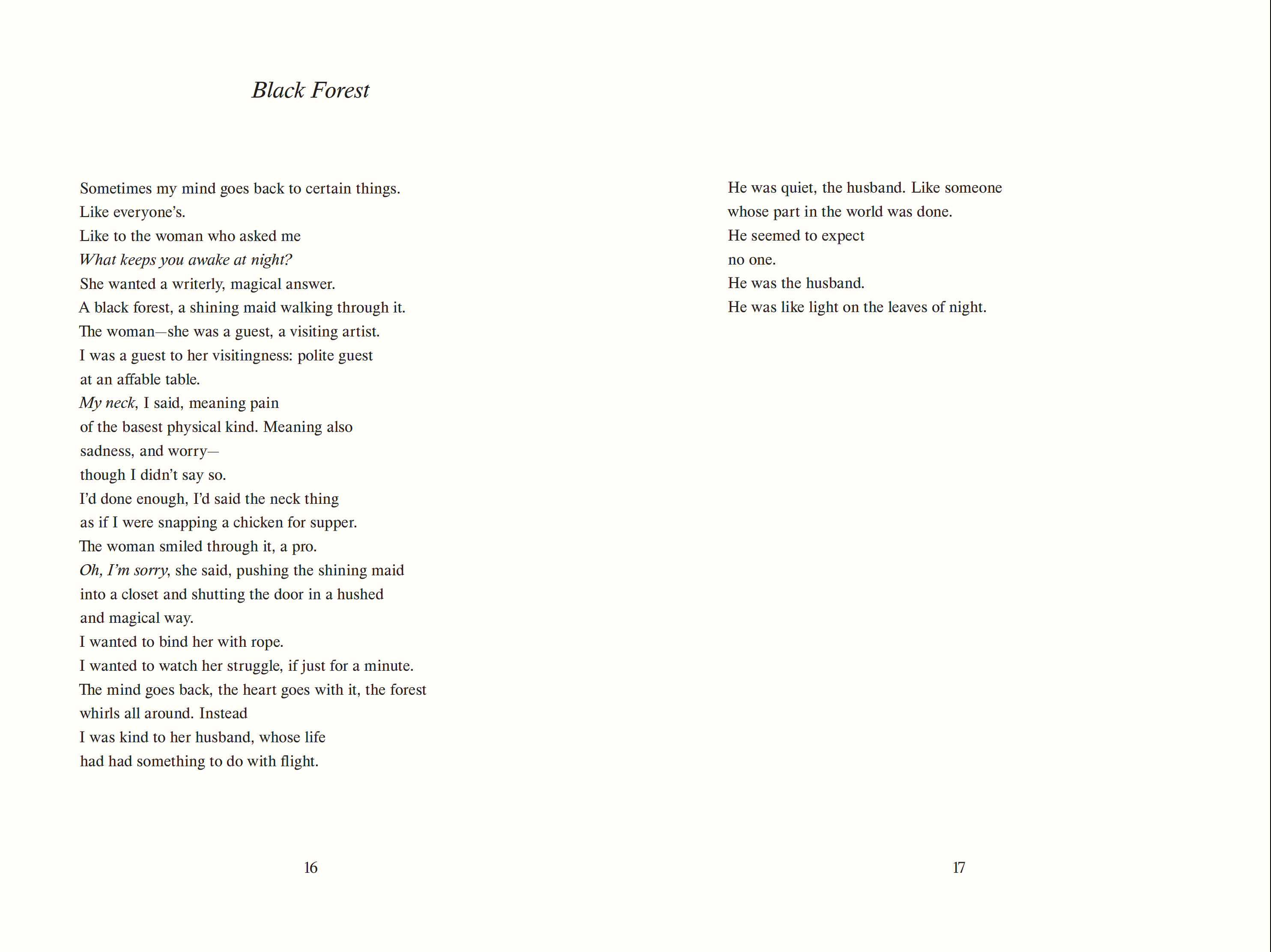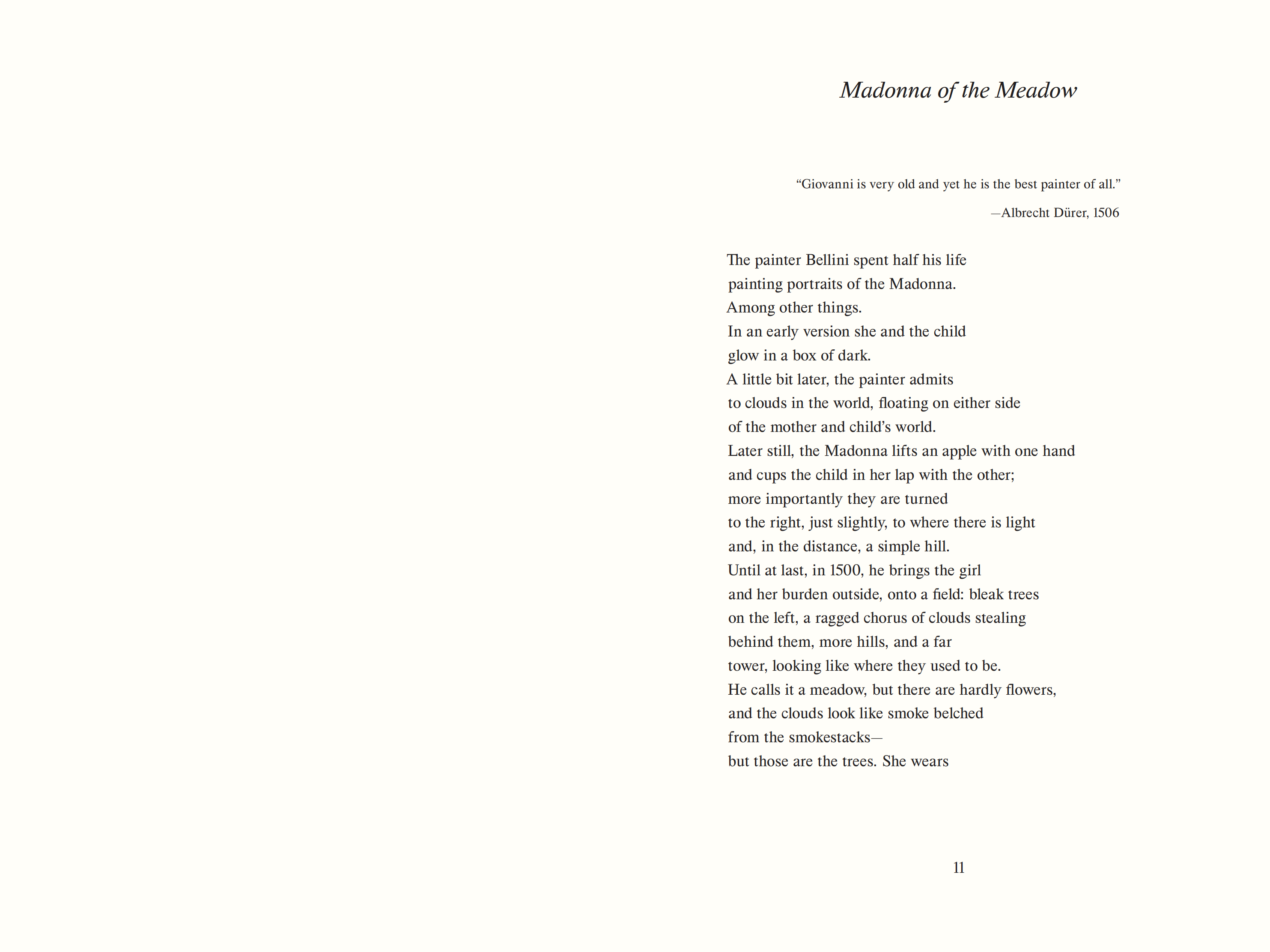 The “country”  of these poems is not, or not only, the idyllic backdrop of a pastoral scene; it is also, more ominously, the kind of country defined by a flag, dark borderland, and violent history. In other words: place of separation. Writing about the works of Bellini, Newbern shifts focus away from the paintings’  subjects and into the scenery where landscape is what constitutes the irreducible distance of the subjects from every other thing. “The Madonna of the Meadow cannot also be the Madonna not of the Meadow,”  Glück writes in her foreword. “No one thing can be everything.”  A Night in the Country is haunted by figures of loneliness who attend to their isolation with a spirit of religiosity, for them a necessary art. This is a quietly astonishing book about the enduring discrepancy between what we hope for and what is possible.